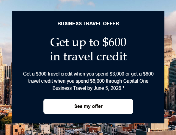 Capital One has sent out a targeted Capital One Business Travel promotion that allows eligible cardholders to earn up to $600 in travel credits when booking through the Capital One Business Travel portal.