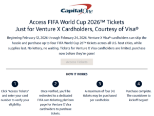 Capital One is giving Venture X cardholders exclusive early access to FIFA World Cup tickets starting February 12, 2026 at 12:00 PM ET.