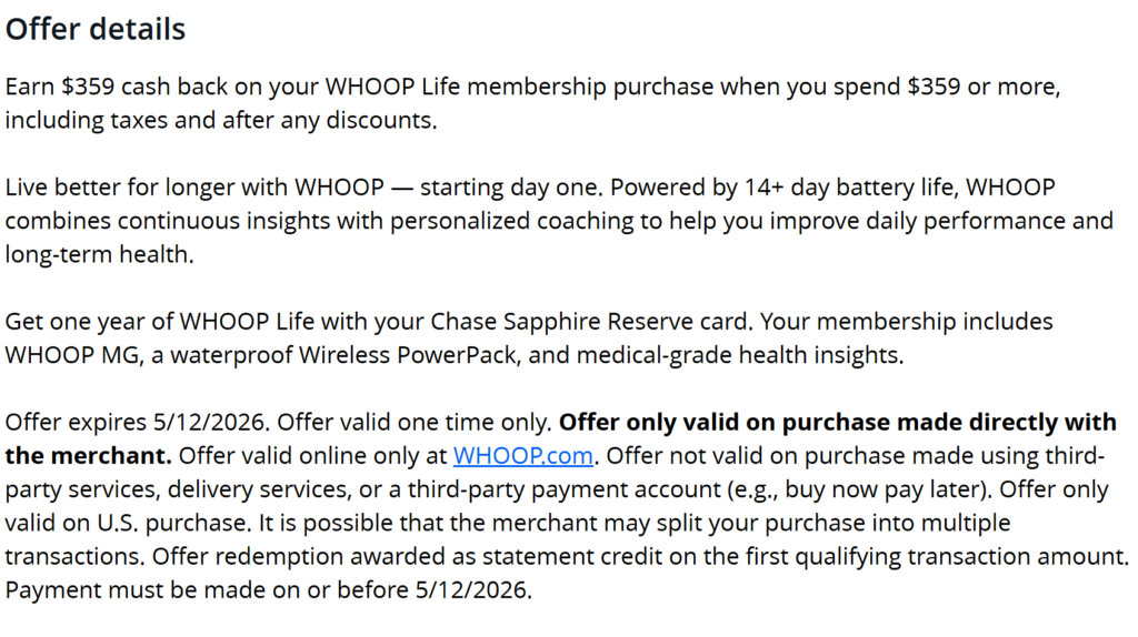 Chase Sapphire Reserve® cardholders can now get a FREE one-year WHOOP Life membership worth $359, thanks to a new Chase Offer that provides $359 back on a $359+ purchase. This effectively makes WHOOP’s top-tier subscription completely free for one year.